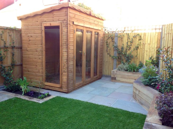artificial lawn , classic , planting plants , sculpture , shed , water feature